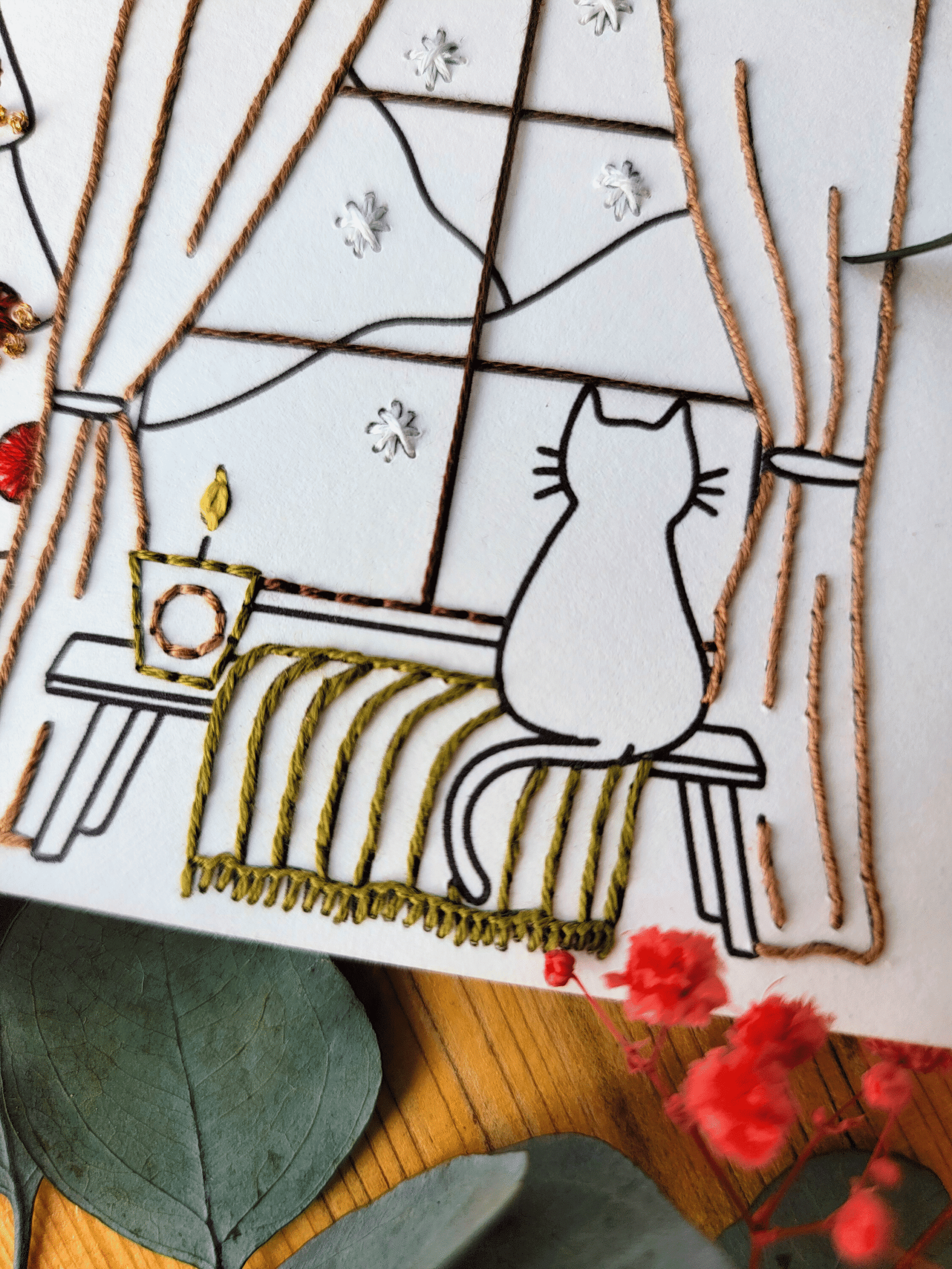 Cette carte à broder Noël de la marque Maison Camomille invite à ralentir et à savourer la chaleur du foyer. On y découvre un intérieur cocooning. Plaid moelleux, bougie scintillante, chat rêveur regardant la neige tomber, et les cadeaux soigneusement disposés sous le sapin. Ce modèle à broder capture toute la magie des fêtes et la transforme en un moment créatif.